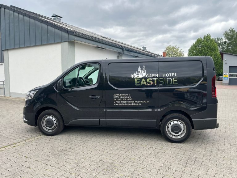 Werbefolierung für Hotel EASTSIDE – dezente Eleganz mit Aslan Chromfolie auf Renault Trafic. Werbung, die sich stilvoll zeigt.