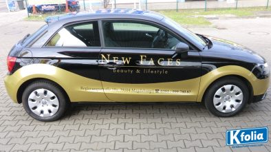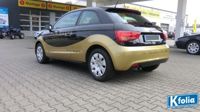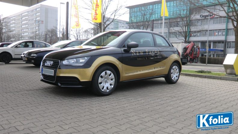 Ja, ist er nicht goldig! Für das Magdeburger Kosmetikstudio „New Faces“ kreierten die K’folia-Designer diesen Audi A1. Die geschwungene Linienführung ist Teil des Firmendesigns und symbolisiert passend zum Thema Entspannung und Schönheit.