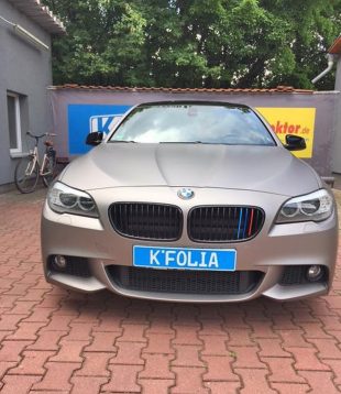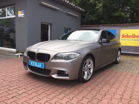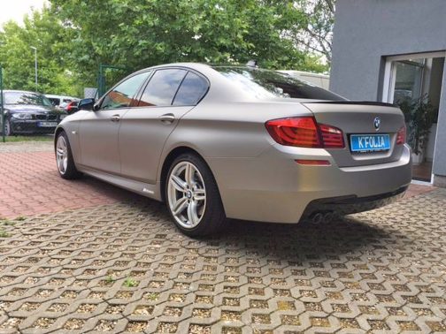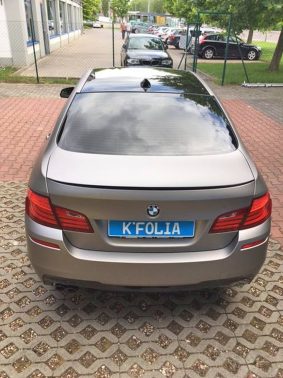 Matt und glänzend zusammen, passt das? Bei diesem 5er BMW zweigen wir, dass es richtig geil aussieht. Den Wagen haben wir von Dunkelblau auf Silbergrau vollfoliert und anschließend das Dach, die Spiegel und Chromleisten in Hochglanz-Schwarz gestaltet.