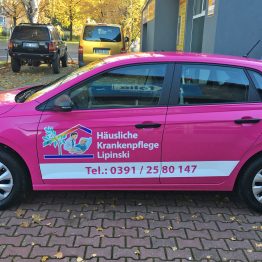 Was fällt an diesem Foto besonders auf? Ihr denkt an die leuchtstarke Magenta-Folie oder die auffällige Digital-Werbebeschriftung für die Häusliche Krankenpflege Lipinski GmbH? Nein! Es ist das Laub vom letzten Herbst auf den Fotos, die wir doch fast vergessen haben zu posten. 😉