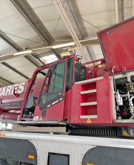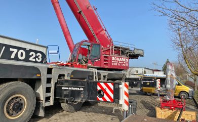Kranfahrer müssen bekanntlich oft nach oben gucken. Da kann die Sonne ab und an stören. Gut, dass es getönte Scheiben gibt. Bei diesem DEMAG AC 350/6 haben wir alle Scheiben der Steuerkabine ausgebaut, getönt und wieder eingeklebt. Die Maschine war natürlich ein bisschen zu groß für unsere Werkstatt. Deshalb haben wir die Arbeiten direkt beim Kunden vor Ort durchgeführt.