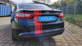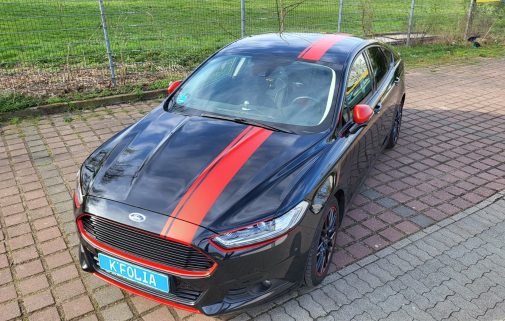Träumst du davon, dein Auto, Motorrad oder Boot in ein Unikat zu verwandeln? Unser jüngstes Meisterwerk, ein Ford Mondeo, strahlt jetzt in einem exklusiven Design mit 3M 2080 Satin Smoldering Red. Wir haben dem Ganzen mit Rallyestreifen, rot leuchtenden Felgenringen, Spiegelkappen und einer Spoilerlippe vorne das gewisse Etwas verliehen. Grillumrandung in Rot und Streben sowie Scheinwerferumrandung in glänzendem Schwarz setzen kontrastreiche Akzente, die Blicke auf sich ziehen.