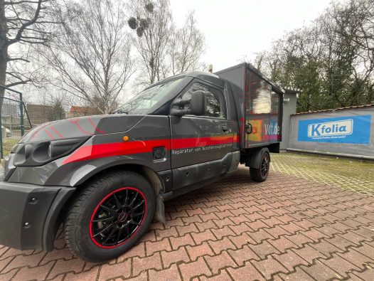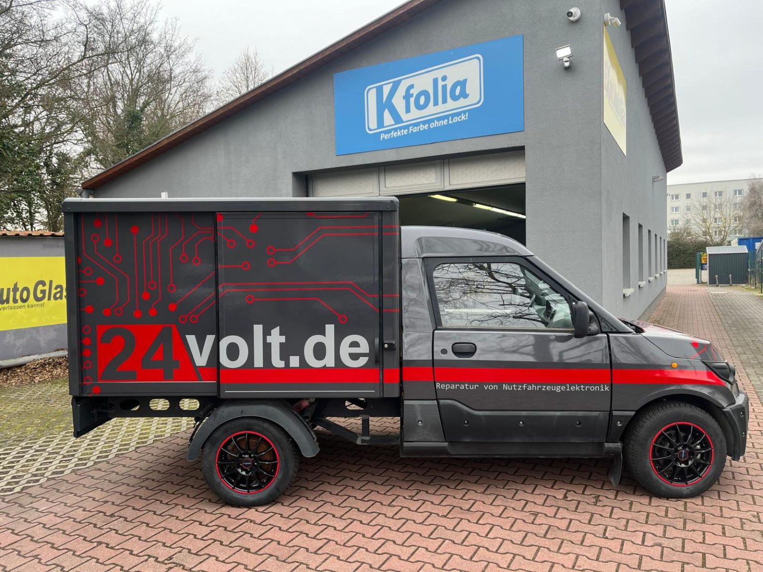 Unser neuestes Projekt ist fertig! Für die Firma 24volt.de haben wir diesen Nutzfahrzeug-Look von Grund auf überarbeitet. Was früher komplett gelb war, glänzt jetzt in einer matt-anthrazitfarbenen Orafol-Folie, die wir von K’folia entworfen und gestaltet haben. Eine absolute Verwandlung – stilvoll und doch dezent. Perfekt für ein Unternehmen, das auf Nutzfahrzeugelektrik spezialisiert ist!