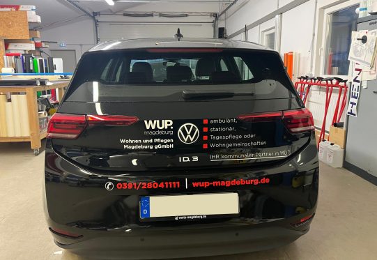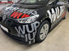 Der VW ID.3 erstrahlt jetzt nicht nur in elegantem Schwarz, sondern trägt eine auffällige Logo-Zeile mit mehrfach wiederholtem WUP-Logo. Diese Gestaltung sorgt dafür, dass der Wagen auf jeder Straße sofort ins Auge fällt – die perfekte Mischung aus Professionalität und Aufmerksamkeit.