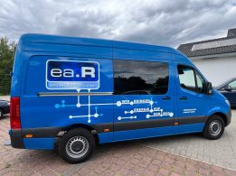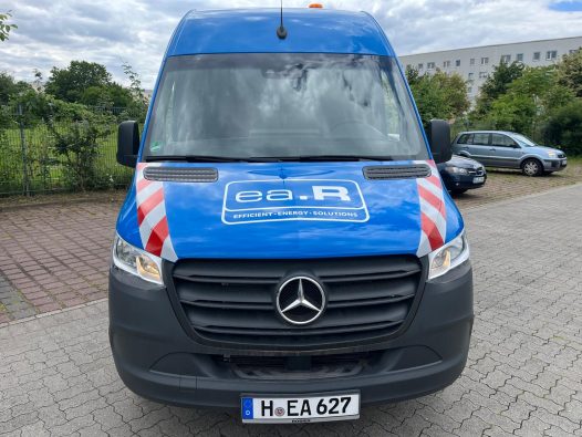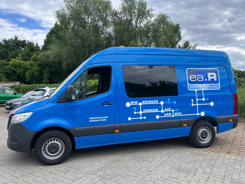 Für die Energieanlagen Ramonat GmbH haben wir diesen blauen Mercedes Sprinter professionell beschriftet und veredelt. Neben der Werbefolierung am Heck und den Seiten sticht der markante Slogan „Wir bringen Energie auf den Weg“ ins Auge – eine klare Botschaft, die perfekt zur Firmenphilosophie passt.
