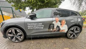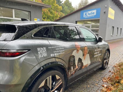 Für die HYLA Handelsvertretung Klück haben wir einen Renault Megane mit einer wetterfesten Werbebeschriftung versehen – und dabei gleich den K’folia-Regentest gemacht! Ergebnis: Wir wurden nass, die Folie bleibt top!