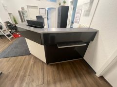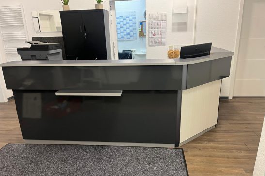 Das Highlight: Der Empfangstresen der Praxis erstrahlt nun in edlem Glanz Schwarz und Grau – natürlich alles mit hochwertiger Folierung. Das Ergebnis? Ein moderner Stil, der Professionalität ausstrahlt und gleichzeitig ein Wohlfühl-Ambiente schafft.
