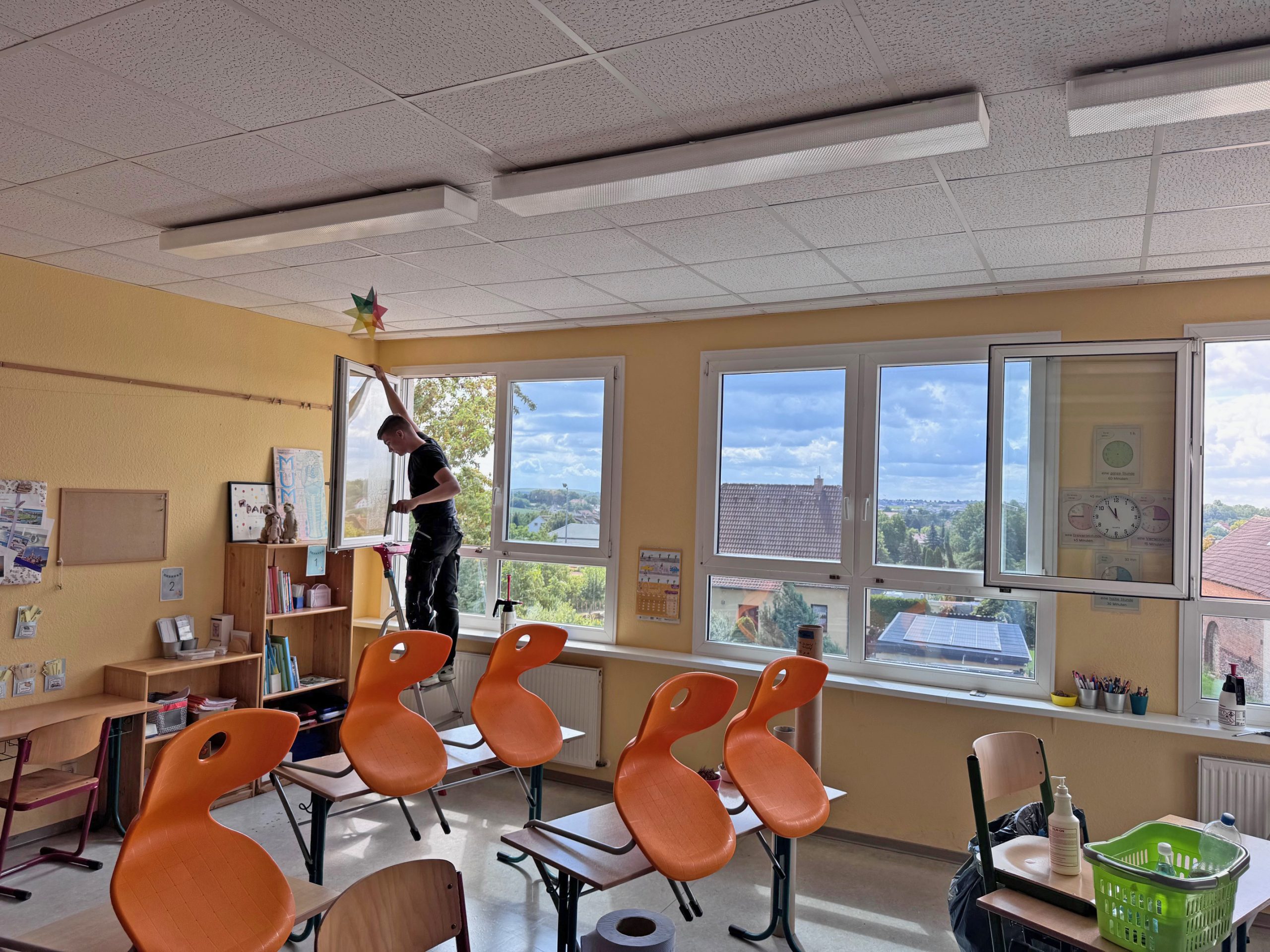 Cool bleiben, wenn’s heiß wird – Kurz vor Schulstart haben wir in der Grundschule „Am Mühlenberg“ in Niederndodeleben für ein kühleres Lernklima gesorgt – und zwar mit professioneller Sonnenschutzfolie von LLumar, Typ RHE35. Insgesamt 48 Fenster wurden mit der stark reflektierenden Folie ausgestattet.