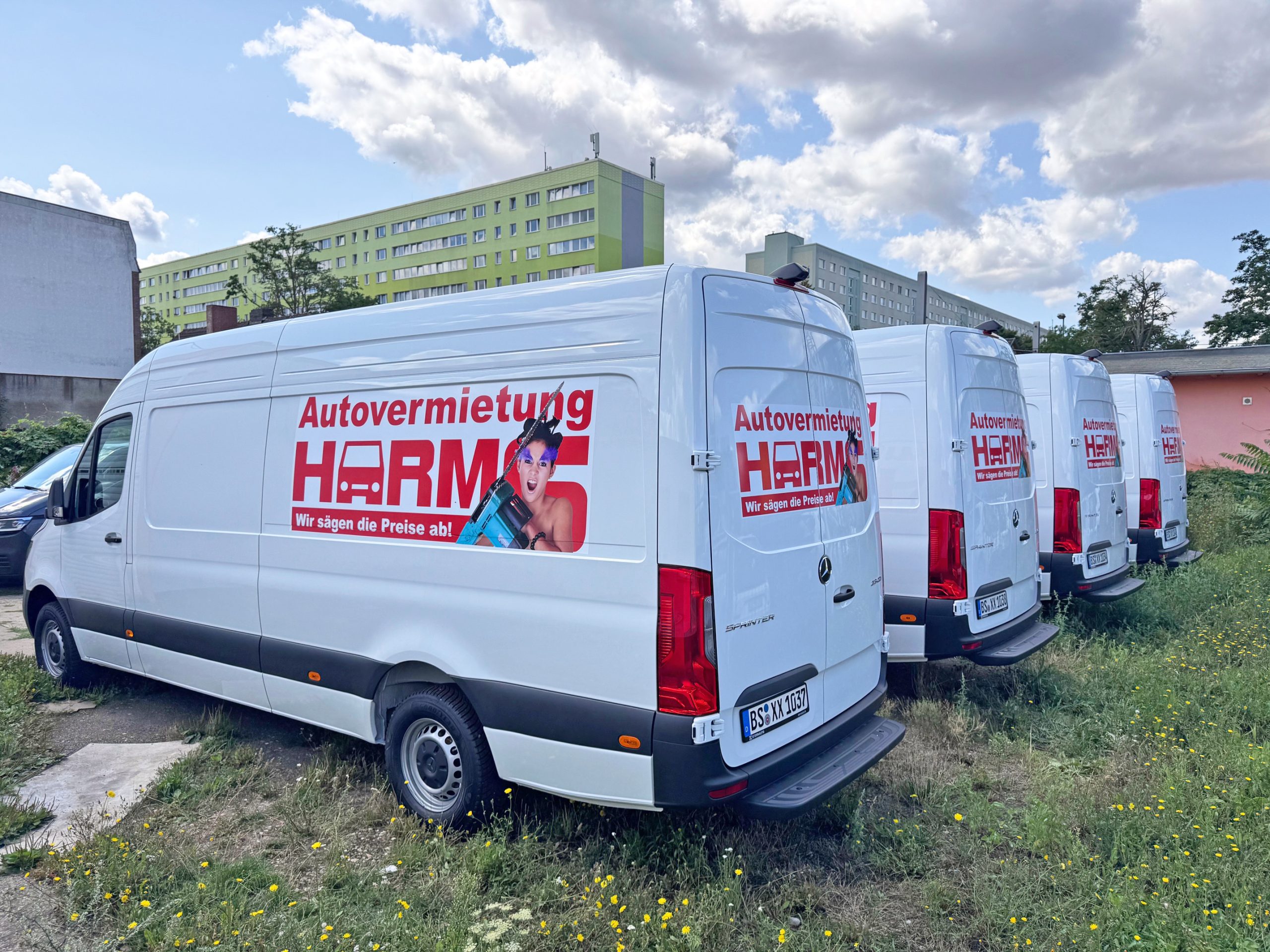 Autovermietung Harms aus Magdeburg meint’s ernst – mit Top-Fahrzeugen und klarer Ansage: „Wir sägen die Preise ab!“. Damit das nicht nur gesagt, sondern auch gesehen wird, haben wir gleich 10 brandneue Mercedes Sprinter mit einer auffälligen Werbefolierung versehen – direkt auf dem Gelände der Vermietung. Kein Umweg, kein Werkstattstress – wir kommen dahin, wo die Fahrzeuge stehen.