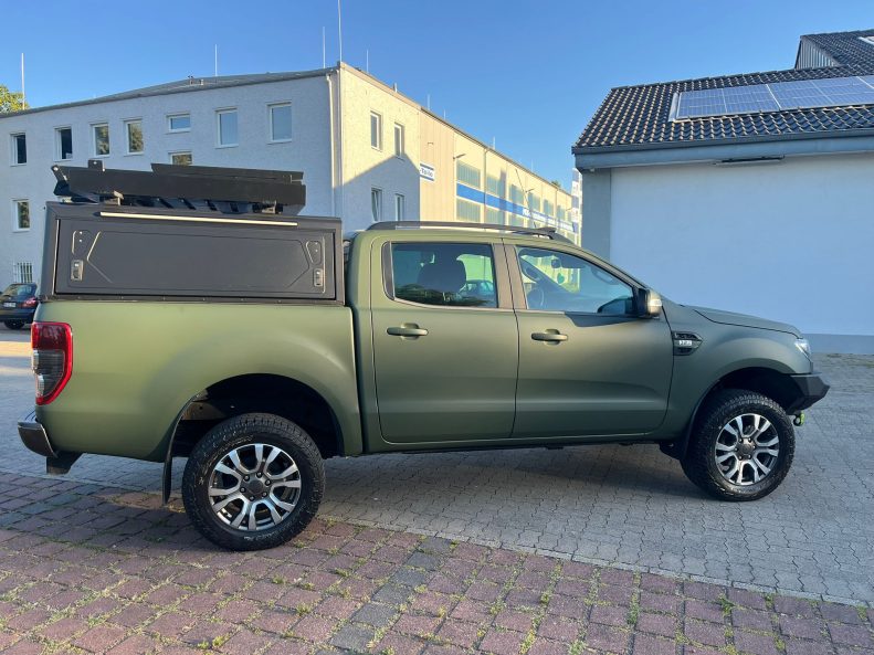 Die matte Oberfläche bringt nicht nur einen satten Farbton auf die Karosserie, sondern unterstreicht auch die Offroad-Optik des aufgerüsteten Rangers mit Alu-Cab Hardtop, Dachträger und Heavy-Duty-Stoßfänger. Kein Glanz, kein Bling – nur pure Präsenz.