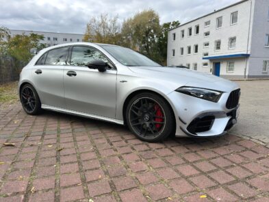 Die matte Oberfläche lässt die Formen des A45s brutal zur Geltung kommen. Das Ganze bleibt natürlich reversibel – eine Lösung für alle, die Performance lieben, aber keine dauerhaften Veränderungen am Lack wollen. Als Eyecatcher haben wir auf dem Spoiler ein dezentes Sternenmuster im Ton-in-Ton-Style angebracht – ein stilvoller Gruß an die Mercedes-DNA.