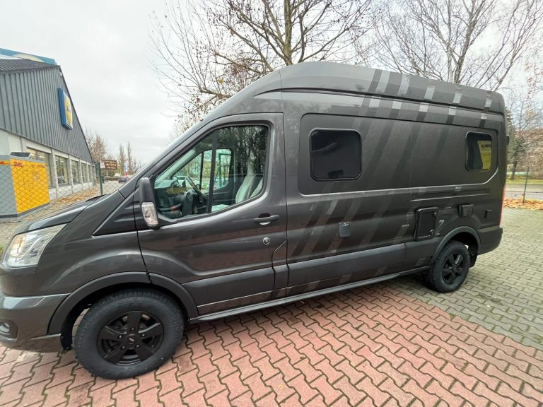 Hier rollt ein echtes Highlight vom Hof: Ein Ford Transit Camper mit edler Designfolierung aus Hexis Honeycomb in Kombination mit matter Motorhaubenfolierung in Schwarz von 3M. Die Basis: ein robuster