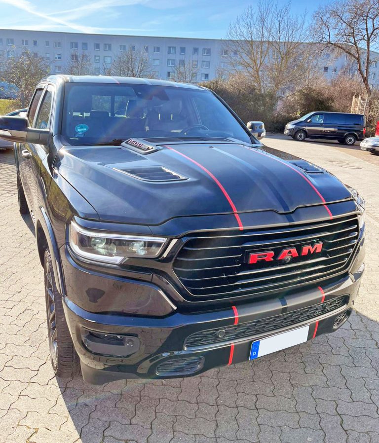 Dieser RAM 1500 Limited hat von uns ein sattes Upgrade bekommen – mit mattschwarzen Designelementen (3M) kombiniert mit knallroten Akzenten (Orafol). Das Ergebnis: Eine kompromisslose Optik, die den brachialen Charakter